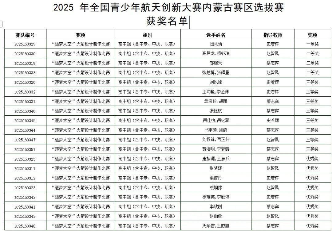 近日,准格尔旗职业高级中学教育集团高中部的20支学生代表队参加了2025年全国青少年航天创新大赛内蒙古地区比赛并全部入围决赛,在决赛中一举斩获1个一等奖,3个二等奖,8个三等奖和8个优秀奖。