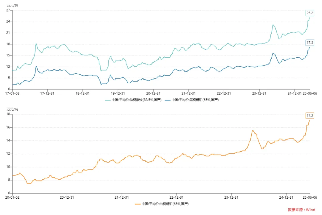 今年以来,钨的表现尤为亮眼。黑钨精矿与仲钨酸铵双双涨至近八年来价格新高。Wind数据显示,截至6月6日,65%黑钨精矿价格已升至17.3万元/吨,较年初上涨21.1%,较2024年均价上涨26.3%;65%白钨精矿价格也达到17.2万元/吨,较年初上涨21.2%,较2024年均价上涨26.6%。受此带动,其重要中间品仲钨酸铵(APT)价格同步上扬至25.2万元/吨,较年初上涨19.3%,较2024年均价上涨24.8%。