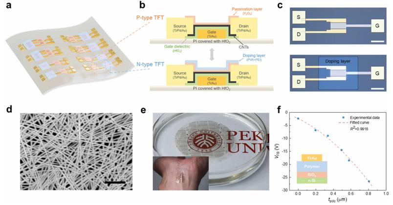 图1:极性可配置的碳纳米管薄膜晶体管(CNT-TFT)及其掺杂机制。(a)在柔性聚酰亚胺(PI)衬底上的极性可配置CNT-TFT和互补金属氧化物半导体(CMOS)电路的示意图。(b)配置为p型和n型CNT-TFT的横截面图,以及(c)相应的光学图像。比例尺,100微米(c)。(d)沟道中碳纳米管薄膜的扫描电子显微镜(SEM)图像。比例尺,500纳米。(e)剥离后的超薄电子箔照片及其贴合在人体皮肤上的共形贴合情况(插图)。背景是北京大学校徽,已获得北京大学授权在此展示。(f)通过拟合平带电压(VFB)和聚酰亚胺厚度(tpoly)进行电荷表征。插图:堆叠电容器结构的横截面图。