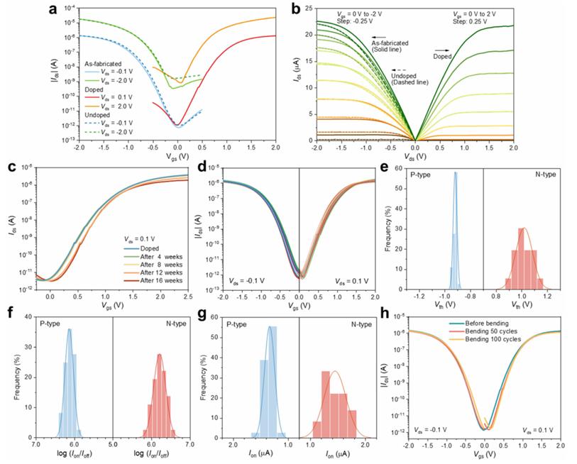 图2:通过可逆地施加和去除掺杂层来配置的、沟道长度为50微米、沟道宽度为100微米的可配置碳纳米管薄膜晶体管(CNT-TFT)的表征。(a)刚制造出来、掺杂后和未掺杂状态下CNT-TFT的转移特性,(b)输出特性。(c)掺杂后的CNT-TFT在16周内的稳定性表征。(d)36个CNT-TFT在掺杂前后的转移特性。(e)阈值电压(Vth)、(f)开关电流比(Ion/Ioff)和(g)开态电流(Ion)的统计分布,以及这些薄膜晶体管的高斯曲线拟合。(h)在固定曲率半径为3毫米的循环弯曲测试中,p型和n型CNT-TFT的转移特性。