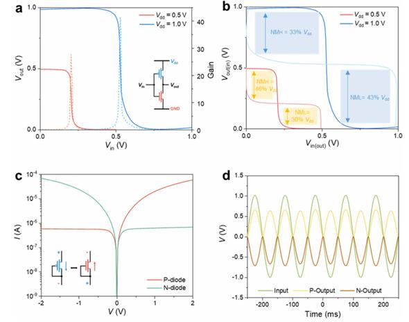 图3:反相器、二极管和整流器的基本可重构电路元件。(a)由两个可配置的碳纳米管薄膜晶体管(CNT-TFT)组成的互补金属氧化物半导体(CMOS)反相器的电压传输特性(VTC)曲线和电压增益。插图:反相器的电路图。(b)与(a)中相同的反相器的噪声容限。(c)配置为p型和n型的碳纳米管二极管的I-V特性。插图:二极管的电路图。(d)配置为p型和n型的桥式整流器的输入-输出特性。