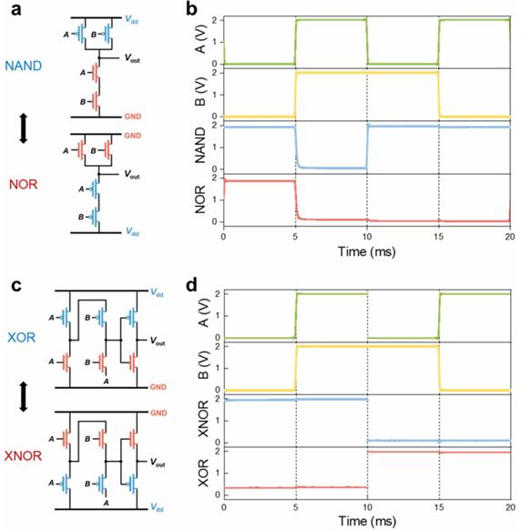 图4:可重构逻辑门。(a)由四个薄膜晶体管(TFT)组成的可重构与非/或非逻辑门的电路图,以及(b)其输入-输出特性。(c)由六个TFT组成的可重构异或/同或逻辑门的电路图,以及(d)其输入-输出特性。有关重构过程的详细信息,请参阅方法部分。