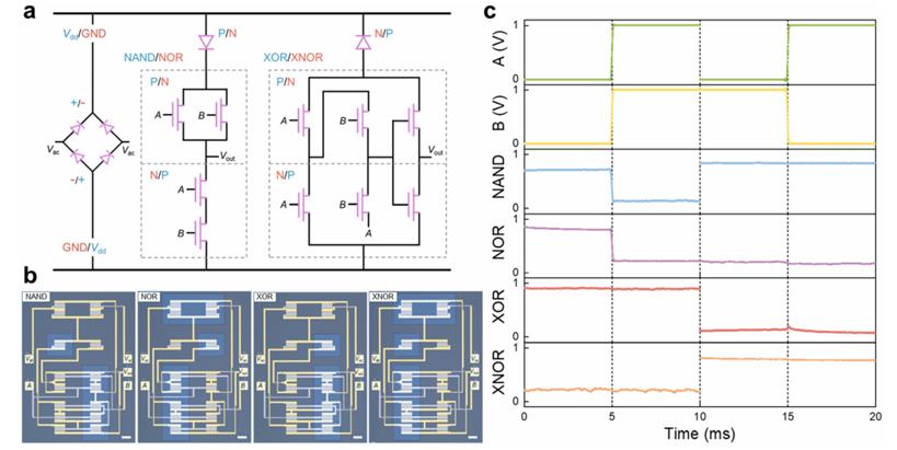图5:具有四种可重构功能的电路模块。(a)示意图,(b)光学图像,以及(c)具有与非/或非/异或/同或功能的可重构电路模块的输入-输出特性。比例尺,100微米(b)。有关重构过程的详细信息,请参阅方法部分。