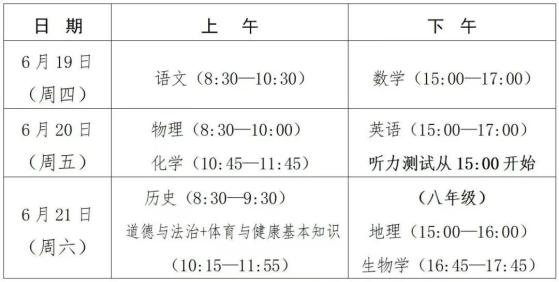 今年我市中考时间为6月19日至21日(周四至周六)。