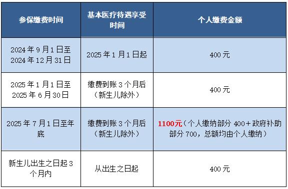 事例:小刘2025年6月30日前参保缴费还是400元,到7月1日以后参保缴费则要缴纳不少于1100元。因为国家对在6月底前参保人员给予不低于700元补助,过了6月30日国家不再给予补助了,要个人全额承担,小刘则要一次性交1100元。