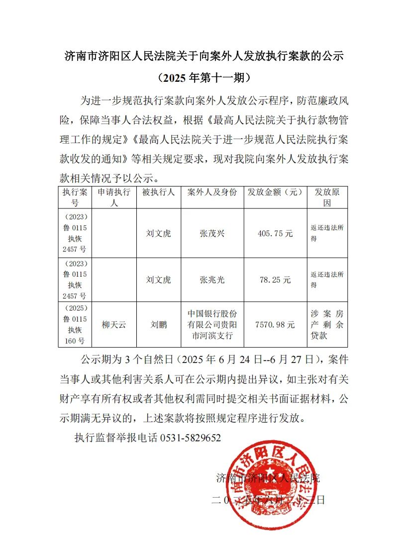 原标题:《济南市济阳区人民法院关于向案外人发放执行案款的公示(2025年第十一期)》