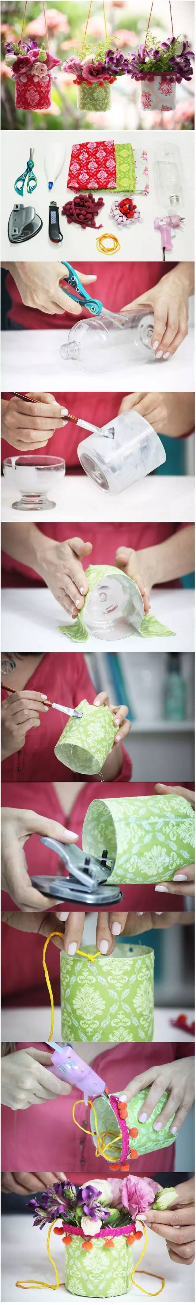 ▼最最普通的塑料瓶,裁成两半,裹上喜欢的布料或彩纸,穿上彩绳就是最美最独一无二的垂吊花盆了。