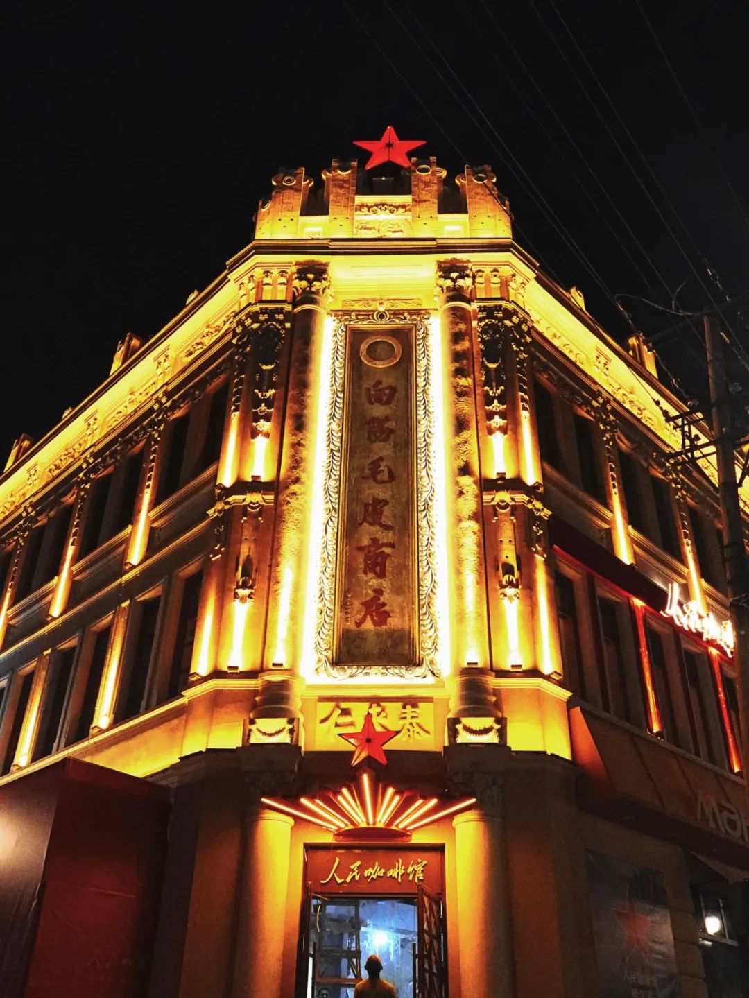 走近咖啡馆,昂扬奋发气息就扑面而来。转角大门楼顶高高矗立的红五角星、“人民咖啡馆”传统书法体字样牌匾,与方额高窗折衷主义风格的中华巴洛克建筑有机融合、相互辉映。
