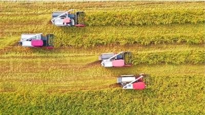 夏收时节,安徽省芜湖市湾沚区六郎镇的农田里,收割机正开足马力驰骋,一派丰收繁忙景象。