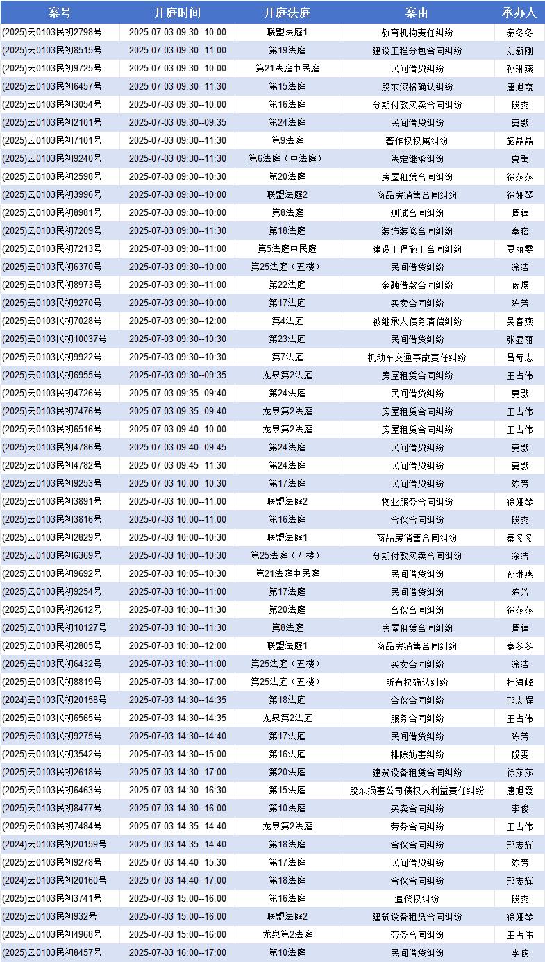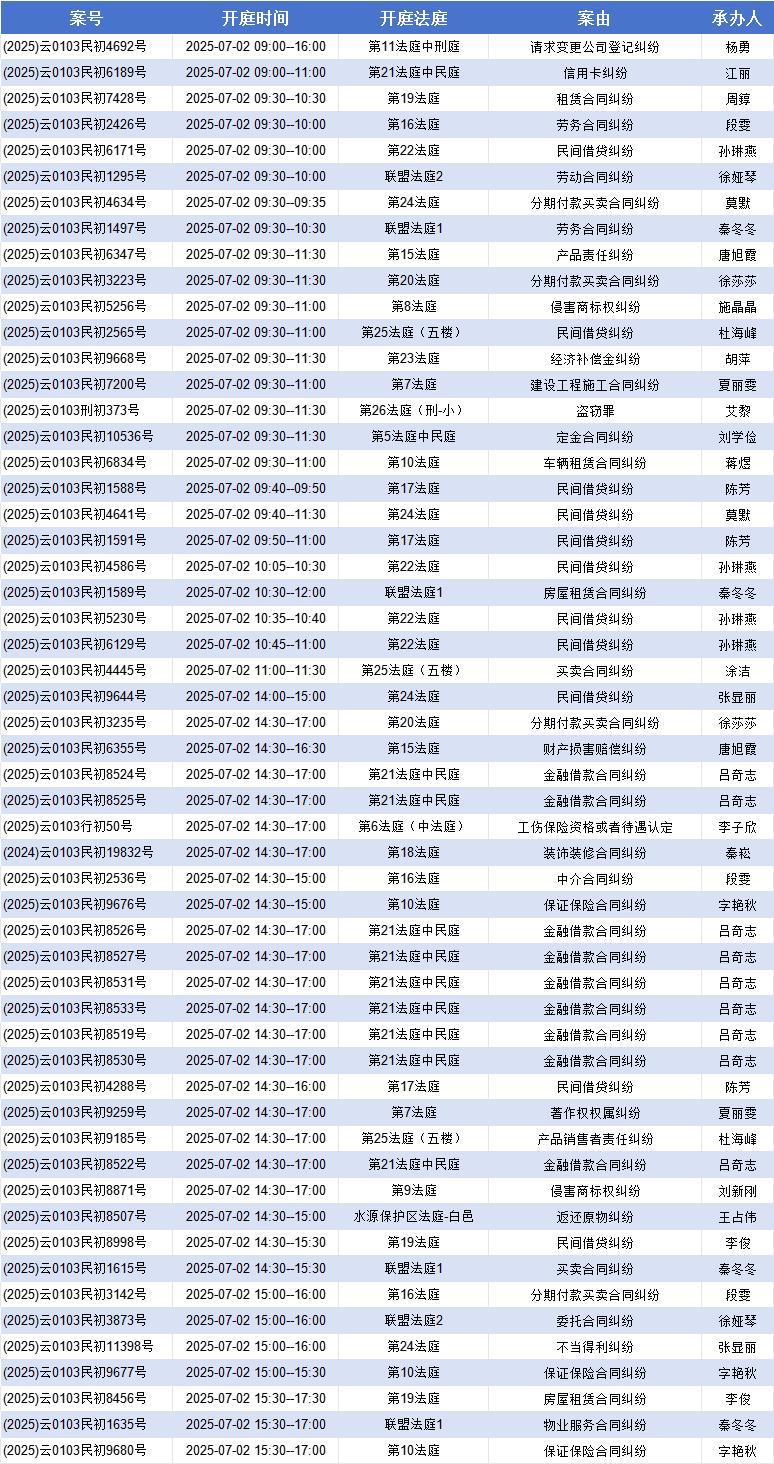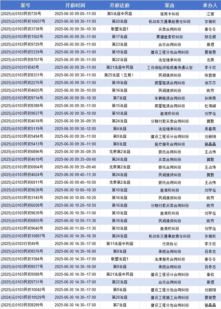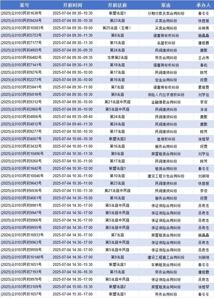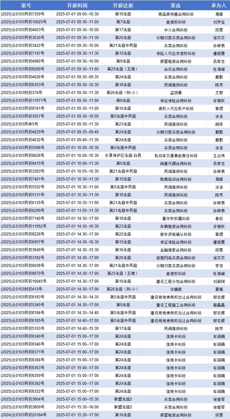 原标题:《【盘法公告】盘龙法院案件开庭排期表(2025年6月30日——7月4日)》