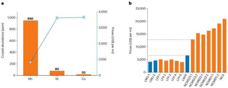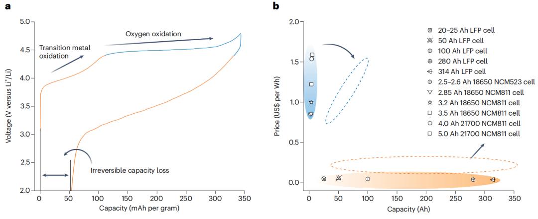 尽管富锂锰基氧化物(LRMO)正极材料具有巨大的潜力,但它们面临着关键挑战,包括循环过程中的电压衰减、氧氧化还原动力学缓慢以及结构稳定性差。解决这些障碍需要在材料和电解液设计方面的创新解决方案。学术界和工业界都在积极寻求解决方案,以实现LRMO材料的商业化。从镍基向锰基正极的转变在长期内对于降低成本仍然具有吸引力。鉴于锰的丰富性以及其用于前驱体合成的电池级硫酸盐的低成本,LRMO材料有望进入低成本、高性能市场。然而,由于缺乏规模化生产,其当前价格仍然不确定(图1b)。
