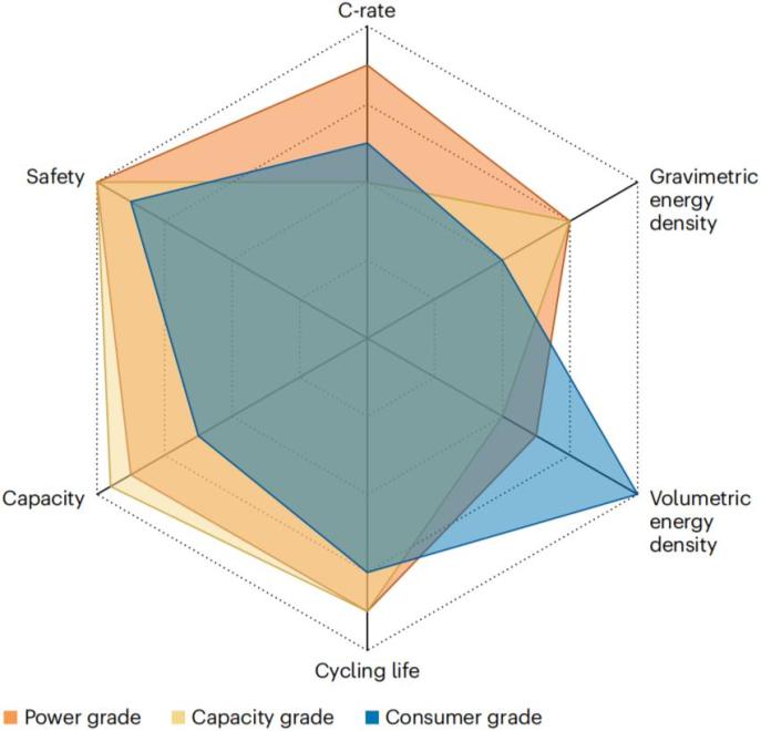 图3. 锂离子电池在功率、容量和消费电池领域的主要考虑因素。