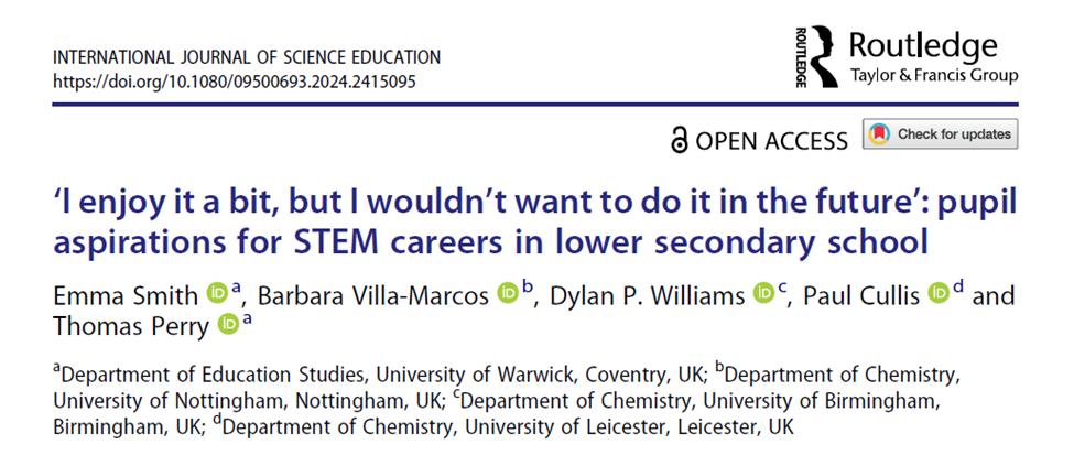 Smith E, Villa-Marcos B, Williams D P, et al. I enjoy it a bit, but I wouldn’t want to do it in the future’: pupil aspirations for STEM careers in lower secondary schools. International Journal of Science Education, 2024, DOI: 10.1080/09500693.2024.2415095.