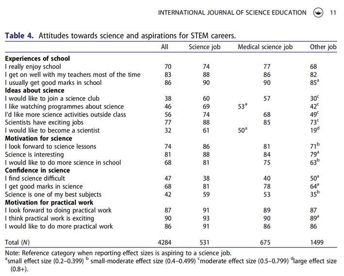 图注: 对科学的态度和对STEM职业的渴望。报告效应量时的参考类别是从事科学研究工作的。a小效应量(0.2–0.399),b小-中等效应量(0.4–0.499),c中等效应量(0.5–0.799),d大效应量(0.8+)。