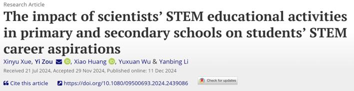 Xue X Y, Zou Y, Huang X, et al. The impact of scientists’ STEM educational activities in primary and secondary schools on students’ STEM career aspirations. International Journal of Science Education, 2024, DOI: 10.1080/09500693.2024.2439086.