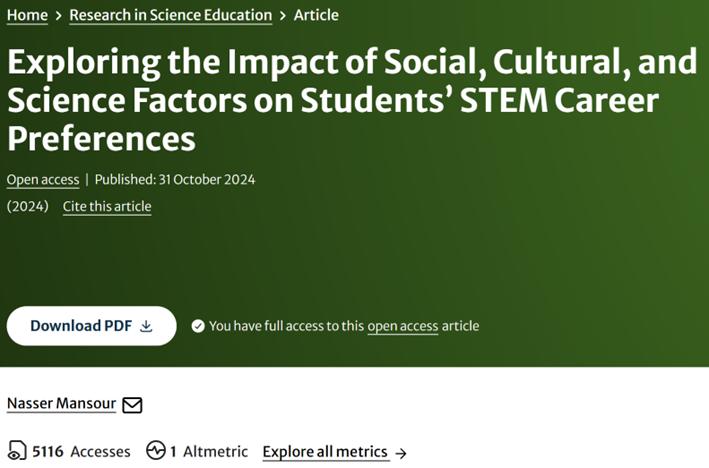Mansour N. Exploring the impact of social, cultural, and science factors on students’ STEM career preferences. Research in Science Education, 2025, 55: 641–668.
