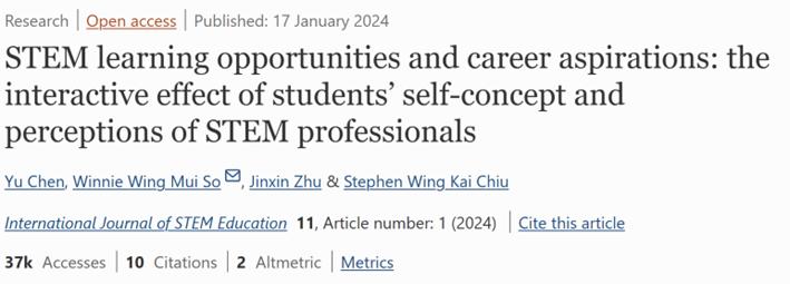 Chen Y, So W W M, Zhu J X, et al. STEM learning opportunities and career aspirations: the interactive efect of students’ self-concept and perceptions of STEM professionals. International Journal of STEM Education, 2024, 11: 1.