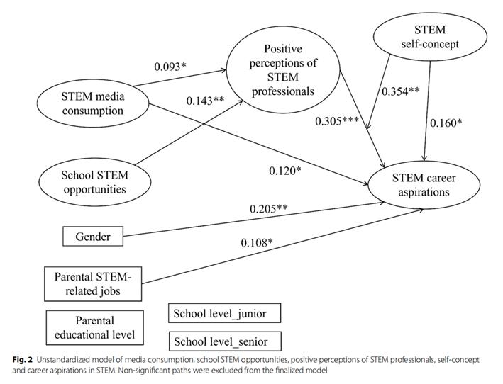 图注:媒体消费、学校STEM机会、STEM专业人士正面认知、STEM自我概念和职业抱负的非标准化模型。最终模型中排除了不显著的路径