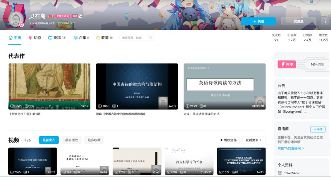 此外在李永毅的哔哩哔哩账号“灵石岛”上,他还上传了包括学术讲座、说文解字、英语学习、拉丁语课等在内的多种视频学习资源。一方面,他希望学生在有限的课堂外,能够随时巩固知识、进行系统性学习;另一方面,他也希望能为喜好拉丁语文学的同道者提供更多可及的学习资源。目前,该账号已吸引近1.7万在古罗马诗歌和拉丁语教学领域的同道者关注。