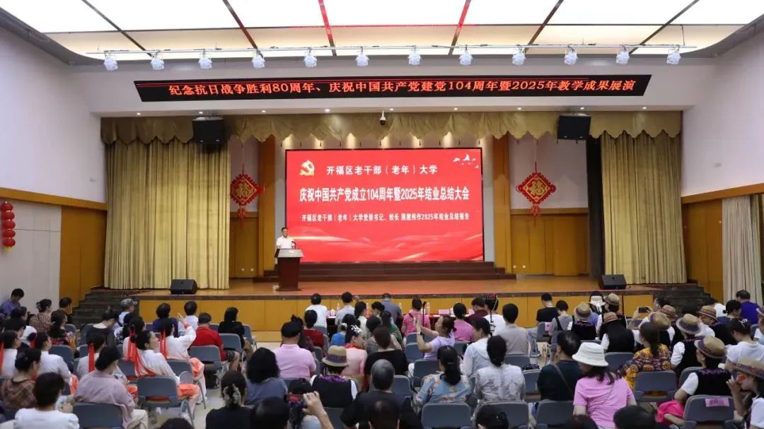 近日,开福区老干部(老年)大学在北辰校区多功能厅隆重举办“和平绘卷,银龄长歌”庆祝中国共产党成立104周年暨2025年总结大会与教学成果展演活动。本次活动由开福区老干部(老年)大学主办,芒果超媒快乐购协办,开福区老干部(老年)大学校长熊建伟、区委老干部局专职副局长周密与200余名师生代表共同见证这场银龄风采的盛会。会议由常务副校长章丽霞主持。