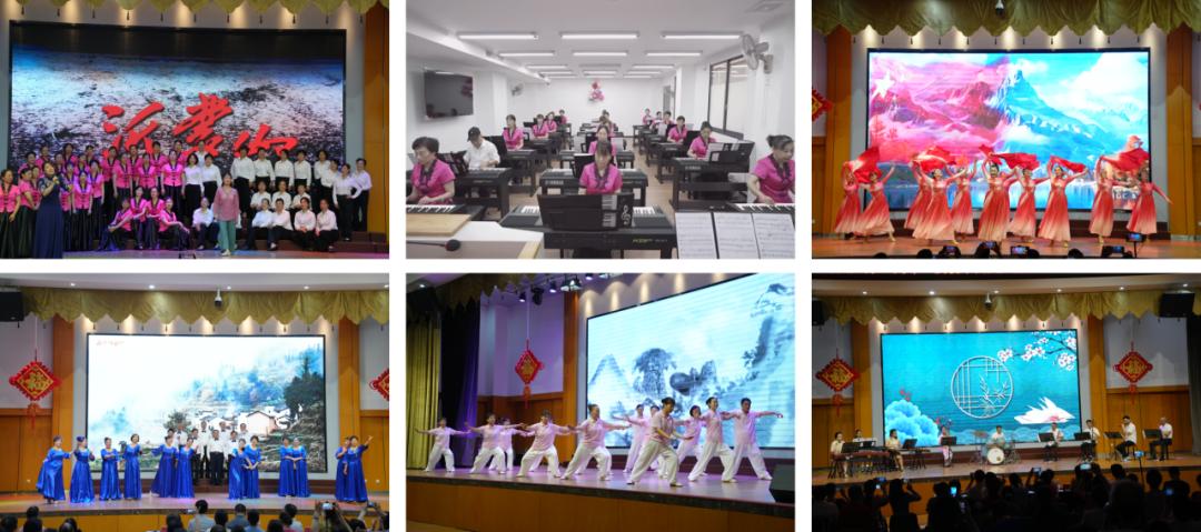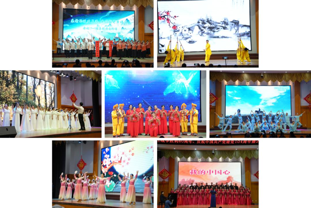诗词23-1班的原创诗词朗诵《平仄开出幸福花》,健身气功23-1班展示《太极养生杖》,声乐22-2班合唱《等你在金秋》,葫芦丝23-1班合奏《月光下的凤尾竹》传递悠扬意境,经络瑜伽23-1班以《画你》展现柔美,形体23-3班用舞蹈《花好月圆》传递美好,每个节目彰显出银发群体的文化创造力,合唱团压轴献唱《我的中国心》将全场气氛推向高潮,共同礼赞盛世,以多样艺术形式,串联起对历史的铭记,对当下的奋进与对未来的憧憬。