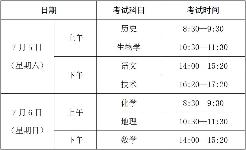 本次考试于7月5日-6日举行,我省共64万余考生报名,全省设345个考点,7万余个考场。学考定时定科统一安排,本次开考7个科目,高一学生考历史、地理、化学、生物学,高二学生考语文、数学、技术。社会人员根据自己本次报名的科目参加考试。