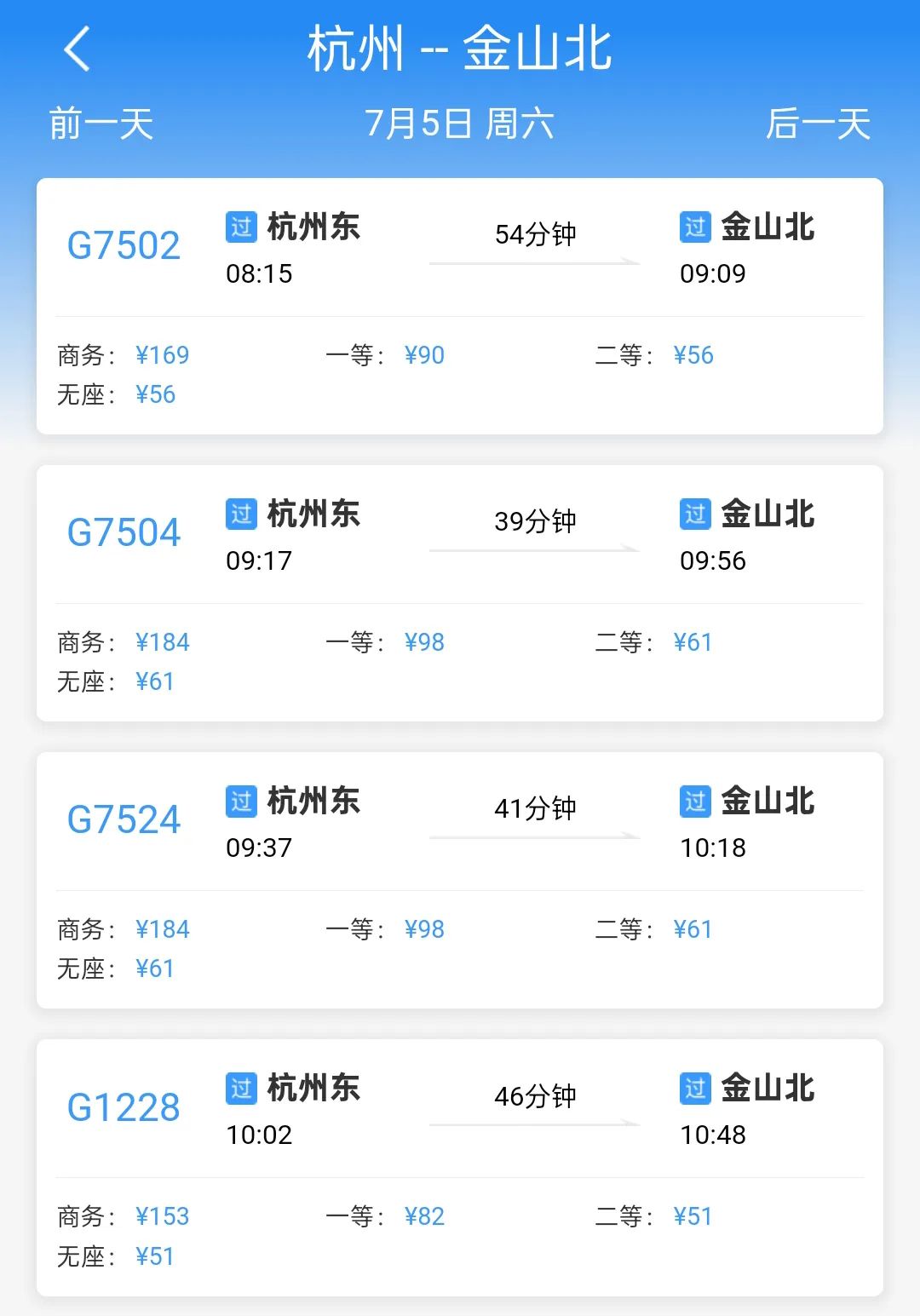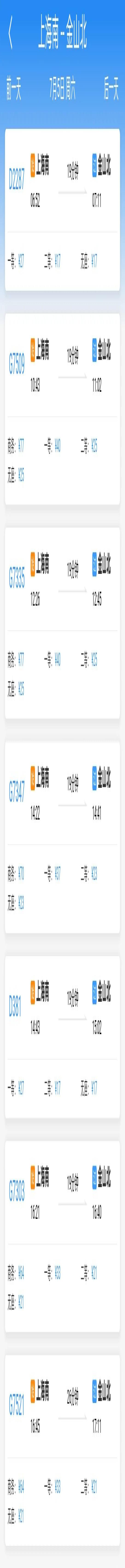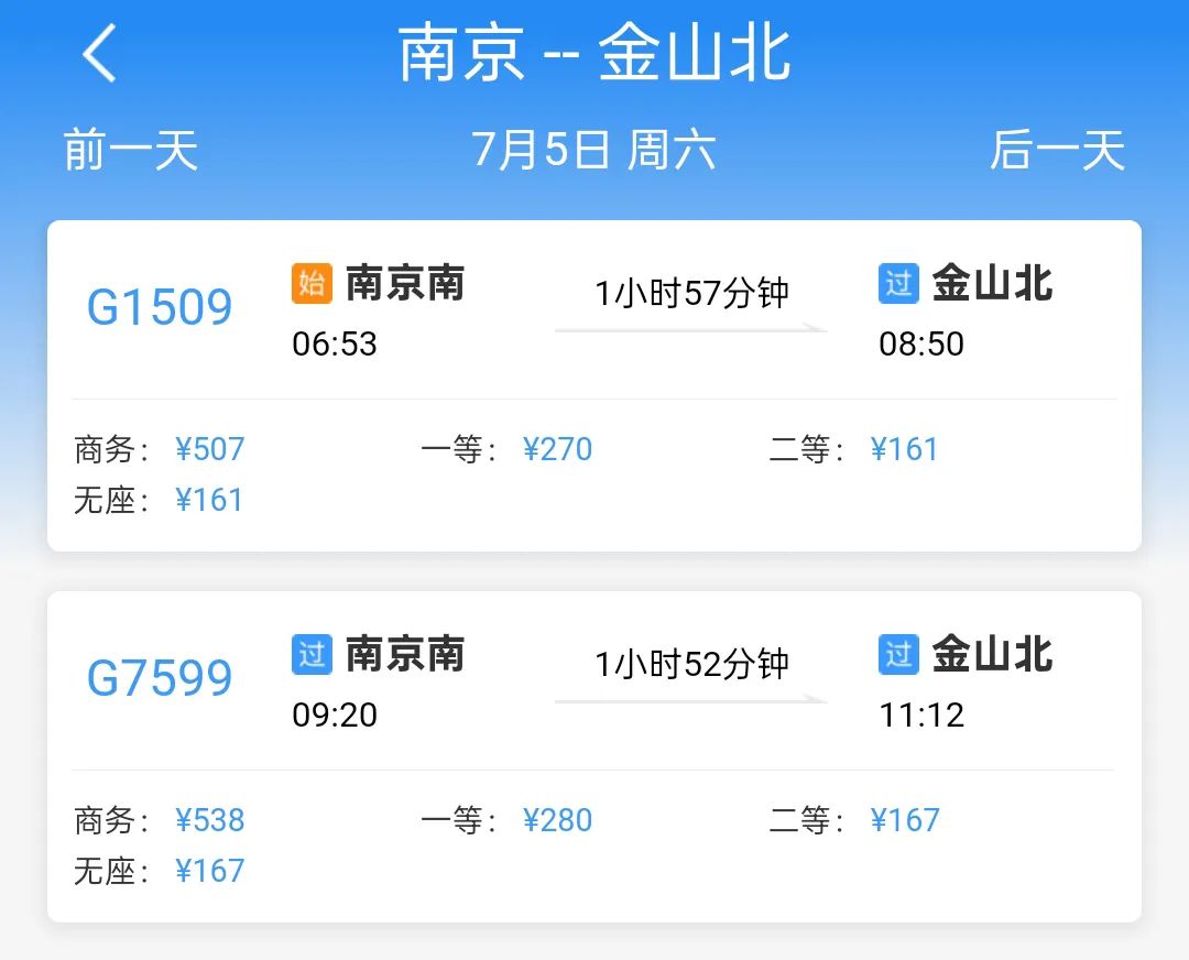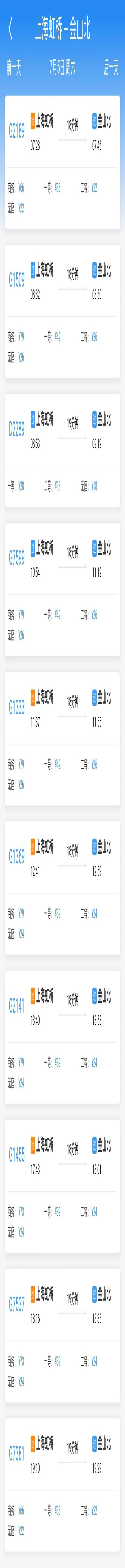 以7月5日当天为例,共有7趟列车从上海南站开往金山北站(6:52-16:45),最快19分钟可以抵达。