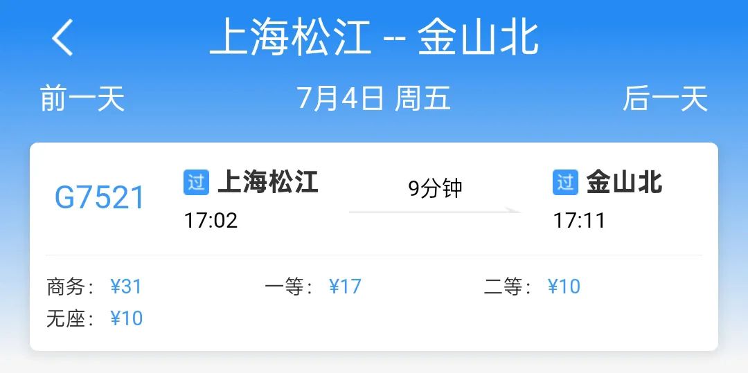 以7月5日当天为例,共有1趟列车从上海松江站开往金山北站,9分钟即可抵达。