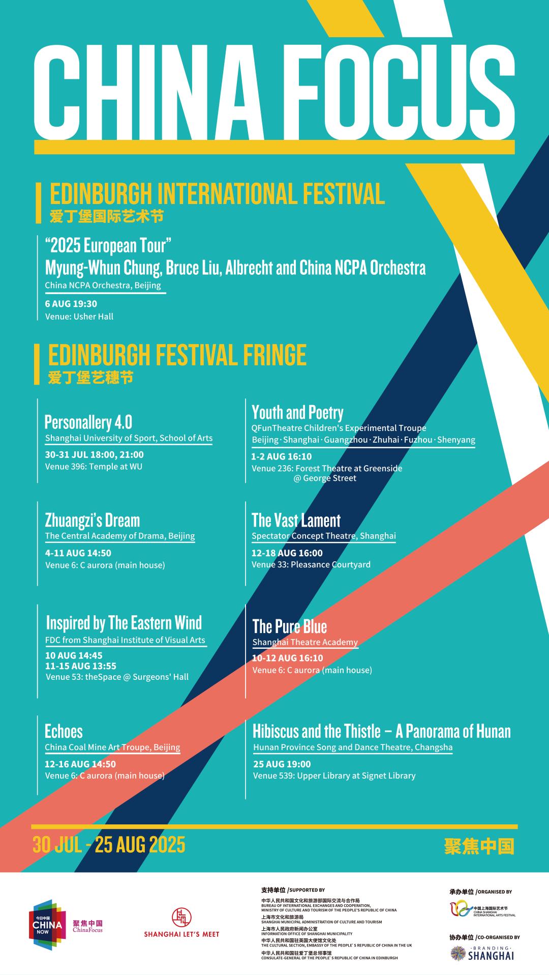 “聚焦中国2025”系列演出将于7月30日至8月25日在爱丁堡集中上演,共计37场演出轮番登场,带来一场贯穿盛夏的艺术盛宴。与此同时,8月11日还将举办“聚焦中国”暨“魅力上海”推介会,搭建中外交流平台,进一步推动中国艺术“走出去”,让世界看见更多元、更鲜活的中国当代表达。