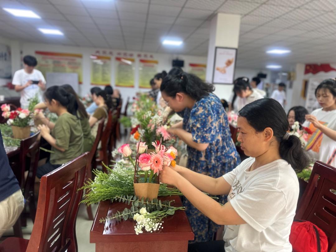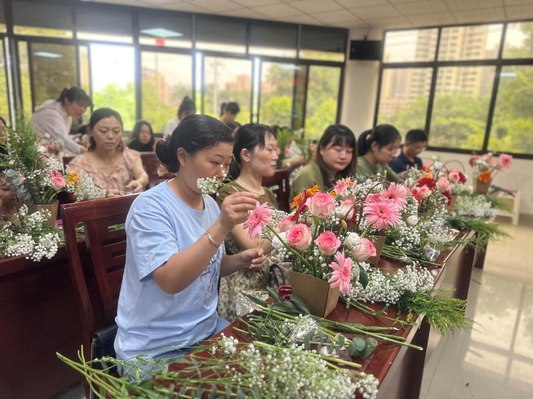 在江公社区,活动以“花绽文明色 家传美德香”为主题,由眉山职业技术学院旅游与财贸学院讲师王娓娓担任主讲。她运用专业理论,系统阐释插花艺术的色彩搭配原理、造型设计技法及花材甄选标准,并深入解读不同花卉蕴含的文化内涵与情感价值。她表示,插花艺术不仅是美化生活的技艺,更是弘扬家庭美德、培育美学素养的重要载体,精心设计的花艺作品能够提升家庭文化氛围,促进美德传承。在实践教学环节,王老师通过现场示范、一对一指导,引导参与女性进行花艺创作,大家兴致盎然,相互品鉴交流心得,现场芬芳馥郁,笑语盈盈。