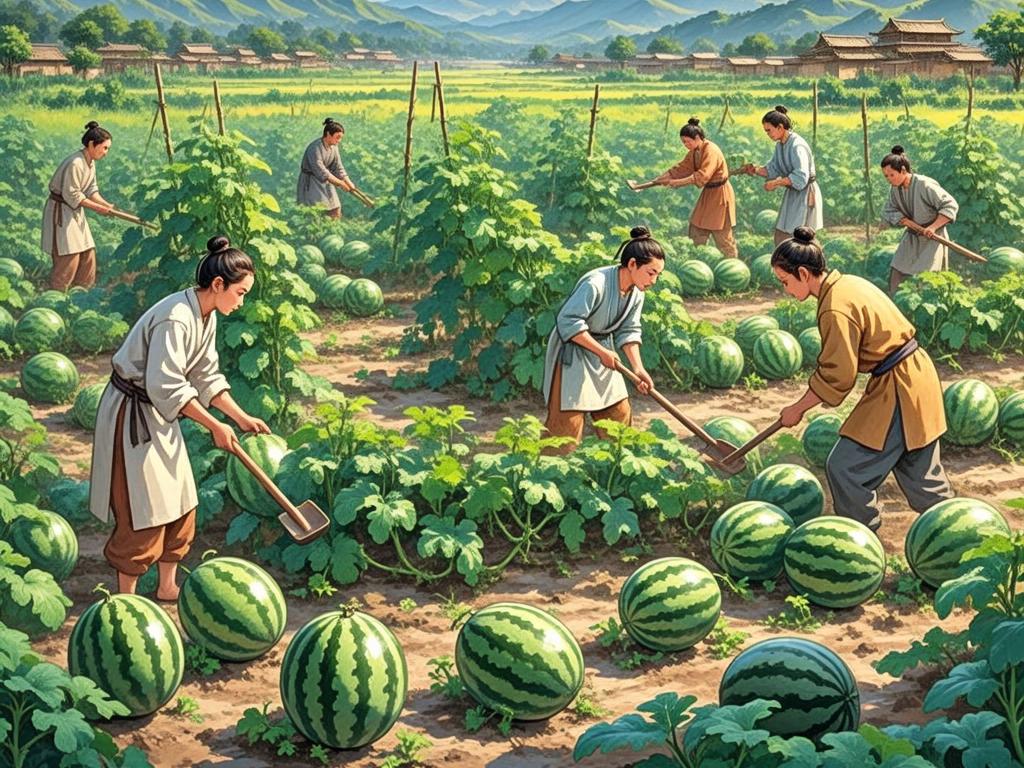 西瓜起源于非洲中部和南部的干旱地区,野生西瓜果实较小且味苦,主要作为水分储存器官存在。考古证据显示,古埃及人早在4000年前已开始栽培西瓜,其墓穴壁画中可见食瓜场景。西瓜通过丝绸之路传入中国,魏晋南北朝时期在中原地区出现,但仅为贵族享用的奢侈品。唐代经济繁荣后,西瓜逐渐普及至民间,并在南方广泛种植,口感不断改良。