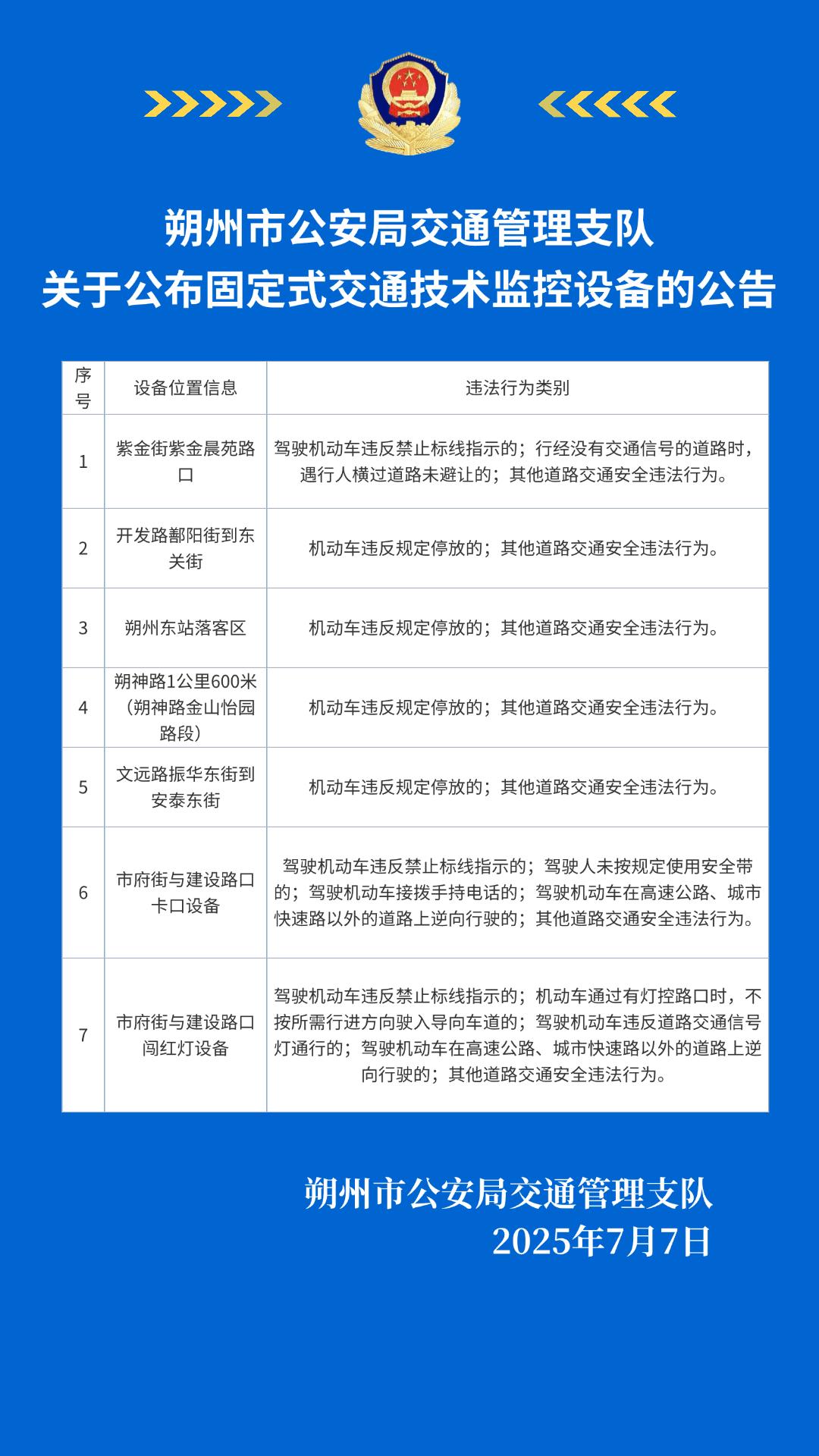 根据《中华人民共和国行政处罚法》《道路交通安全违法行为处理程序规定》等相关规定,现将新增固定式交通技术监控设备予以公布,公示期间自2025年7月7日至2025年7月13日。公示结束后,公安机关交通管理部门将依法对道路交通安全违法行为进行抓拍、取证并予查处。