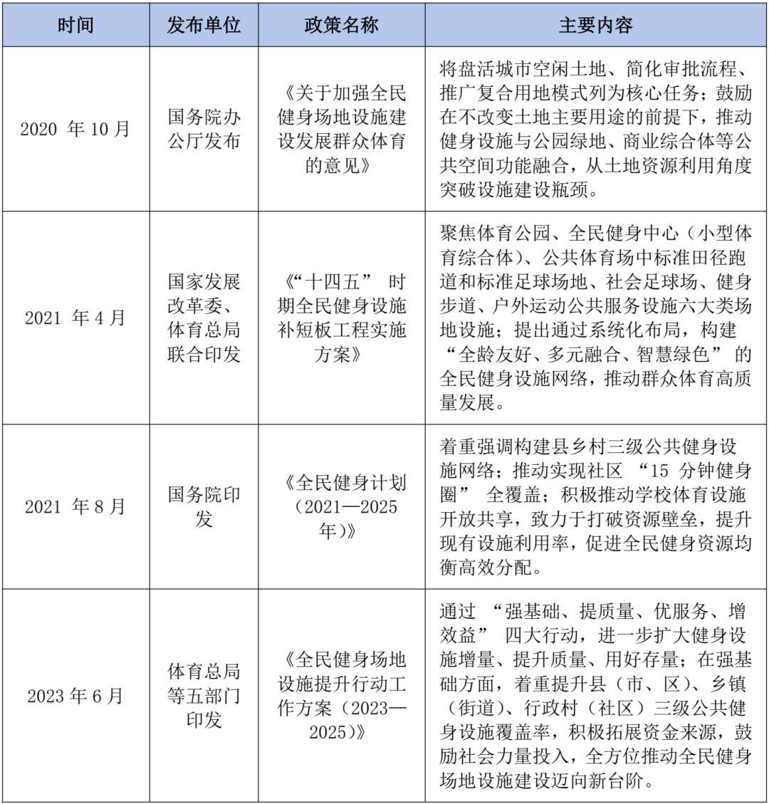 国家围绕健身场地设施建设完善政策体系,为“补短板、促提升”提供顶层设计与行动指引。2020年,国务院办公厅印发《关于加强全民健身场地设施建设发展群众体育的意见》,将盘活土地、简化流程、推广用地模式列为核心任务,鼓励健身设施与公共空间功能融合,突破设施建设瓶颈。2021年,国家发展改革委与体育总局联合印发《“十四五”时期全民健身设施补短板工程实施方案》,聚焦六类场地设施,提出构建全民健身设施网络,推动群众体育高质量发展。同年,国务院印发《全民健身计划(2021—2025年)》,强调构建县乡村三级网络,推动“15分钟健身圈”全覆盖,促进学校体育设施开放共享,提升设施利用率与资源分配效率。2023年体育总局等五部门印发《全民健身场地设施提升行动工作方案(2023—2025)》启动,通过四大行动扩大健身设施增量、提升质量、用好存量。强基础方面,提升三级公共健身设施覆盖率,推动健身场地设施建设上新台阶。