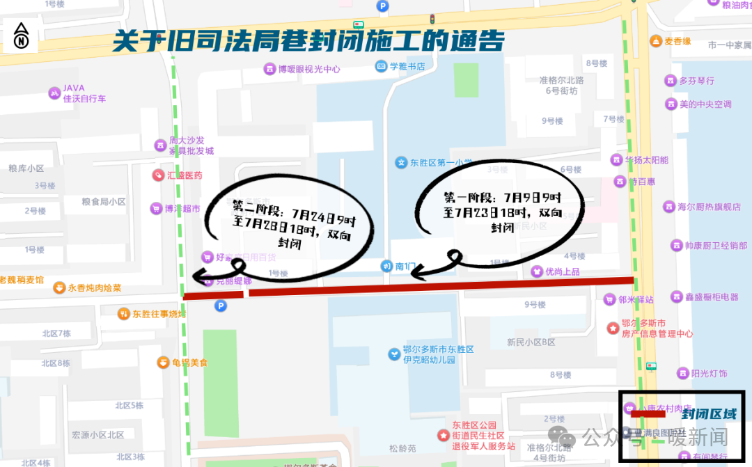 第一阶段(7月9日9时至23日18时):市政府小区南门至巷道与准格尔北路交叉路口全封闭;