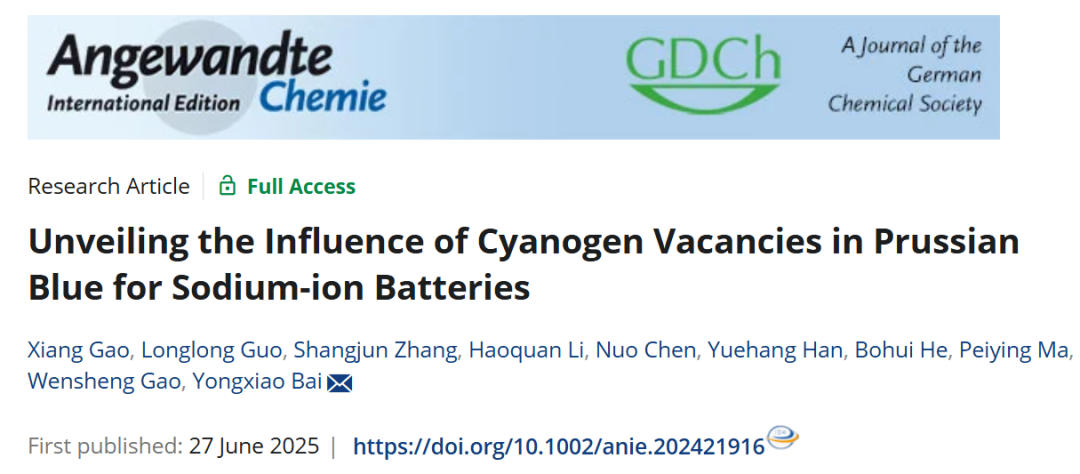 近日,兰州大学材料与能源学院拜永孝教授团队开发出了一种阴离子络合制备钠离子电池正极材料的方法。通过具有不同氰基空位的普鲁士蓝正极材料的可控合成、结构与性能分析来揭示普鲁士蓝中阴离子空位的作用机制。该方法拓展了钠离子电池高稳定性普鲁士蓝正极材料合成的新途径,为该类正极材料的工程化应用奠定了基础。相关成果以“Unveiling the Influence of Cyanogen Vacancies in Prussian Blue for Sodium-Ion Batteries”为题于2025年6月27日被国际著名期刊《Angewandte Chemie International Edition》发表。