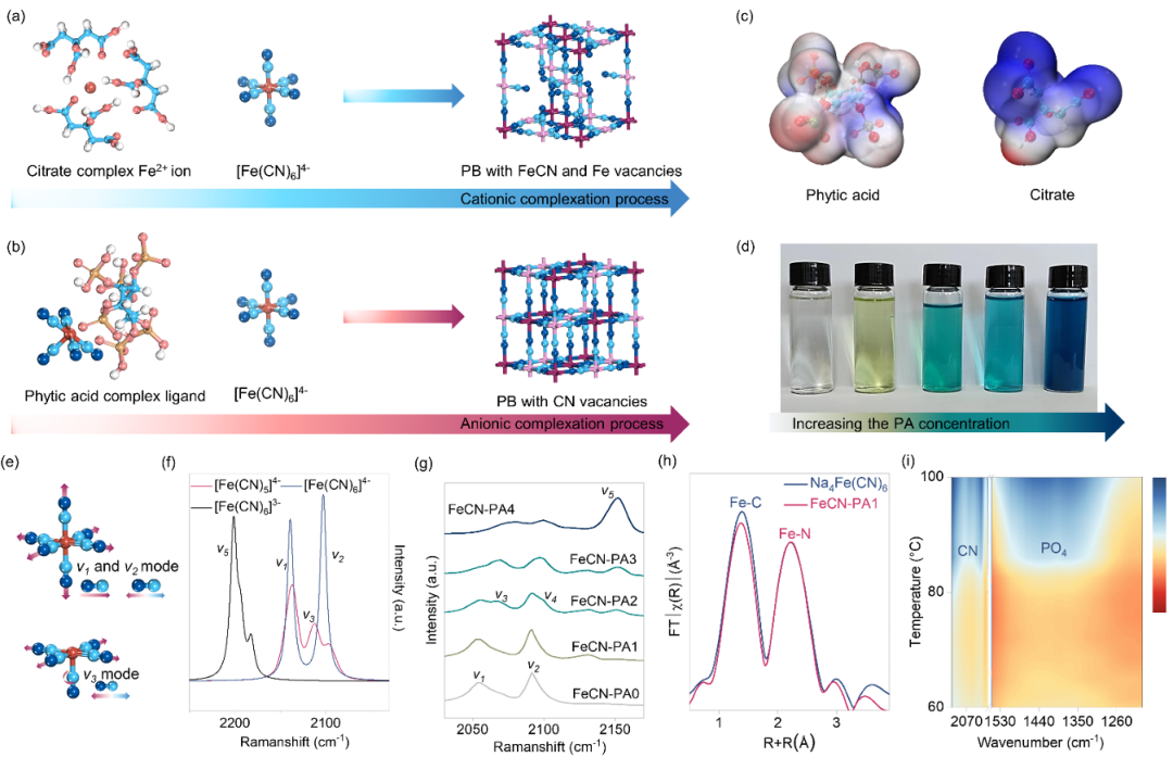 随着可持续新能源的不断发展,开发先进的电化学储能器件对于可再生能源有效集成到智能电网中至关重要。钠离子电池以其钠资源丰富、成本低、安全性高等特点,被认为是最有前途的大规模电网应用储能系统之一。普鲁士蓝(PB)因其高理论容量、低成本及开放框架结构,被视为钠离子电池的理想正极材料。然而,传统共沉淀法合成的普鲁士蓝存在大量[Fe(CN)₆]空位,导致其较差的循环稳定性,难以满足低成本储能的需求。目前广泛采用的阳离子络合剂策略可以有效提升普鲁士蓝的结晶度,但是仍然伴随着较差的低自旋铁稳定性差的问题。有研究表明通过空位工程合理引入阴离子空位可提升稳定性,然而由于阳离子络合剂无法实现对阴离子的结构调控。因此,开发可控合成策略并揭示阴离子空位的作用机制,成为推动普鲁士蓝材料应用的关键。