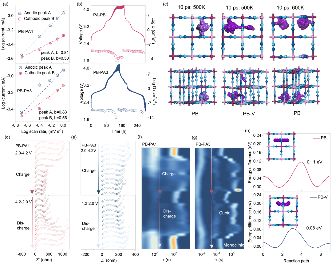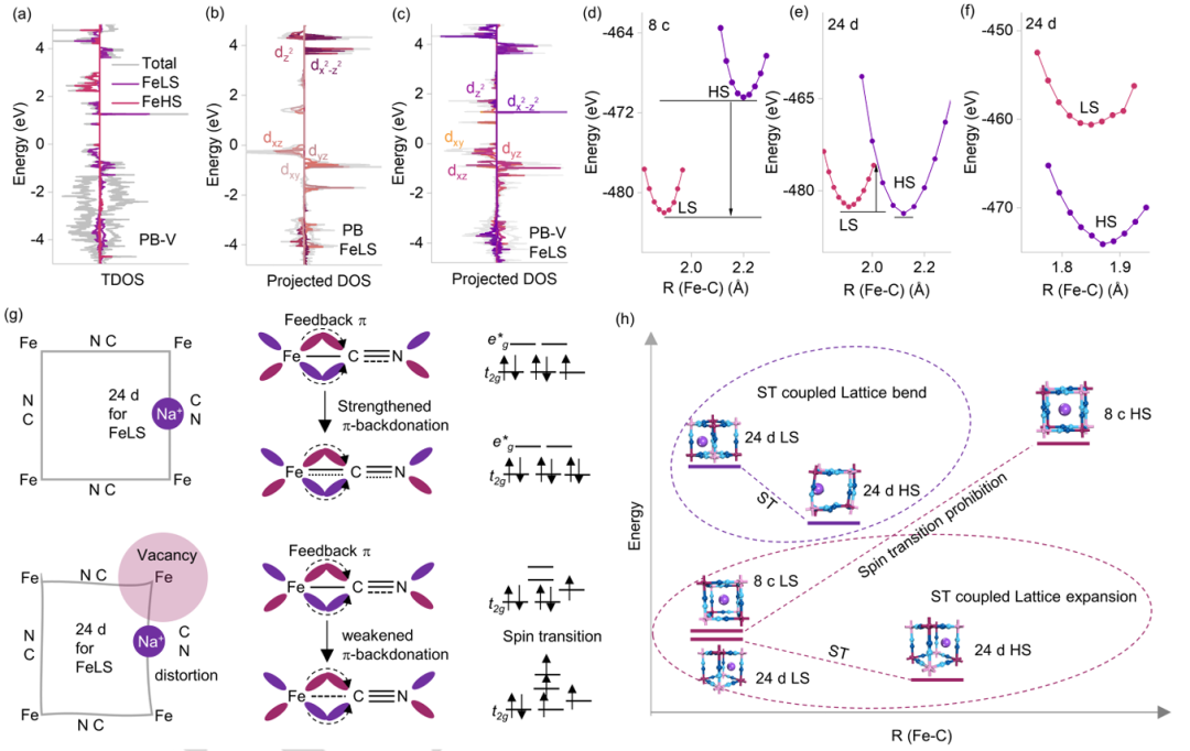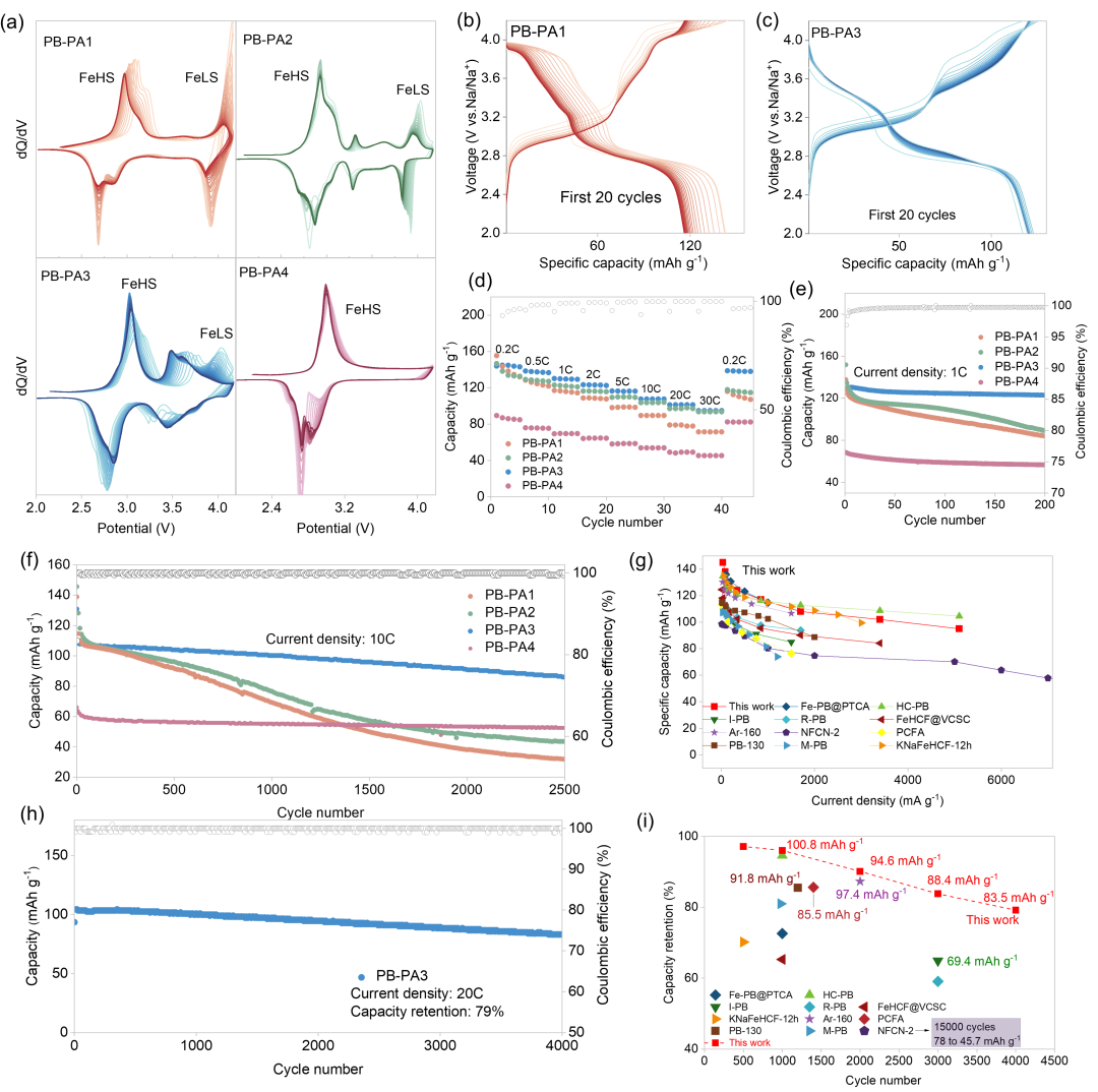 该研究首次提出利用竞争配位作用络合亚铁氰根的阴离子络合策略,实现CN空位的可控引入。(图1)通过原位表征和理论计算阐明了氰根空位通过配体场对称破缺策略将高对称Oh群稳定配体场转变为低对称子群,为电子重新分布并发生自旋翻转提供可能,在电化学性能上表现为不稳定的低自旋铁活性转变为稳定的高自旋铁,从而解决了普鲁士蓝中低自旋铁不稳定的难题。将上述过程总结并提出一种空位诱导下的“自旋转变耦合晶格弯曲”机制(图2)。并且在动力学也证明空位引入可以改变晶体电子云分布并且降低钠离子的扩散能垒,从而提升电极材料的倍率性能,具有优异的快充快放性能(图3)。在20C大电流充放电下循环4000次容量保持率为79%,为迄今报道的最佳PB基钠电阴极之一(图4)。该研究不仅提供了精准调控氰基空位的合成新范式,更通过“自旋转变-晶格弯曲”机制破解了普鲁士蓝材料的长循环稳定性难题,为下一代钠电正极材料开辟了新路径。未来,该方法有望推动低成本储能技术迈向实用化和工程化应用。