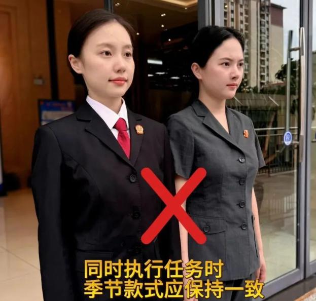(五)着审判制服时,应按季节款式规范穿搭,不得夏季、春秋季、冬季制服混穿,更不得与便服混穿(见图)。