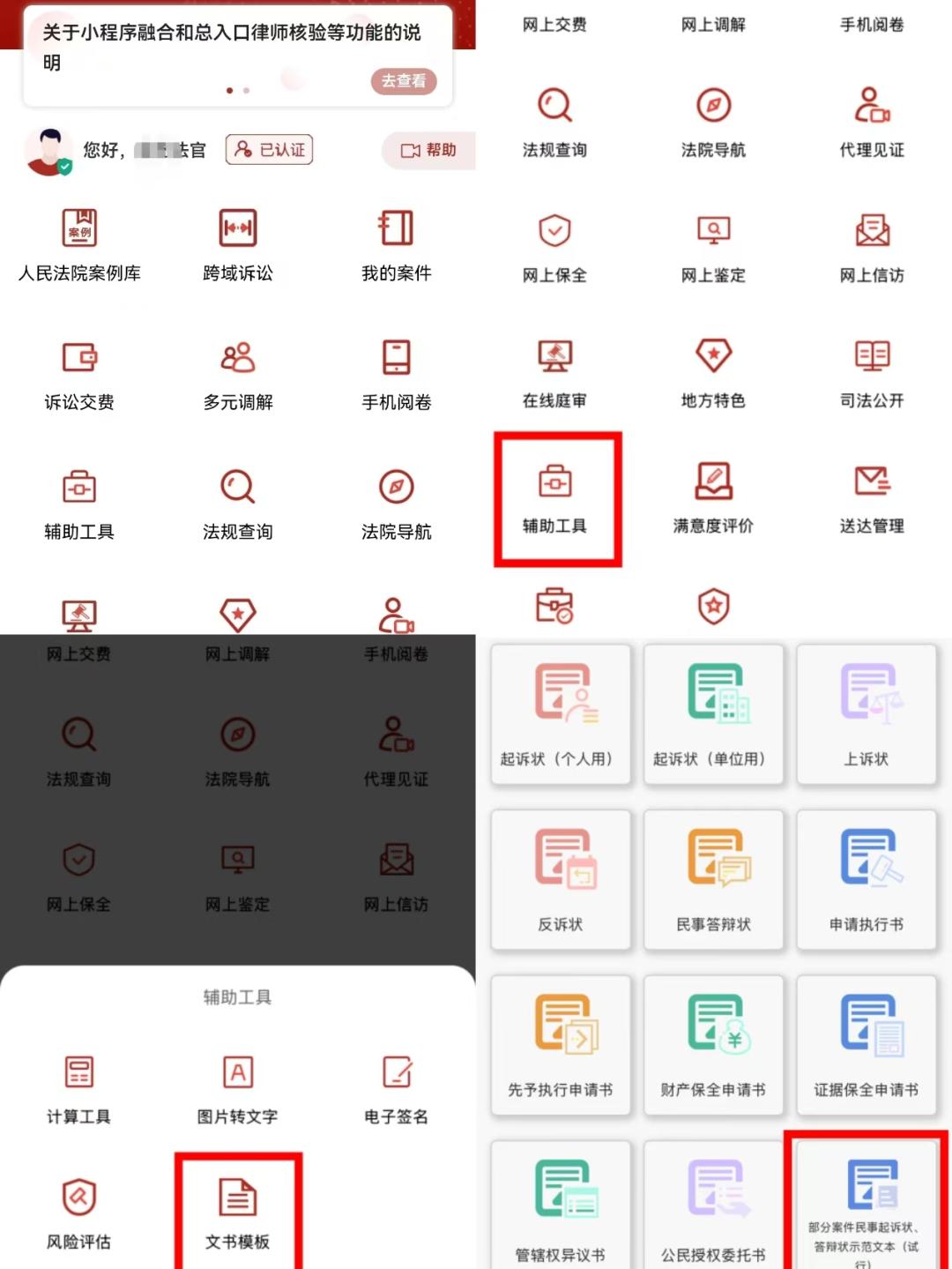 3.微信小程序搜索“人民法院在线服务甘肃”,点击“辅助工具”,打开“文书模板”,点击“部分案件民事起诉状、答辩状示范文本(试行)”,根据需要下载使用。