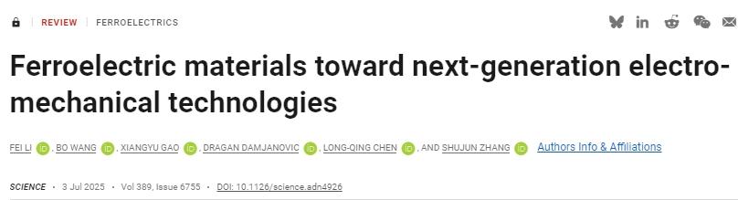 近日,西安交通大学电信学部电子学院、国家医学攻关产教融合创新平台李飞教授团队受邀撰写的综述论文《面向下一代电机耦合技术的铁电材料》(Ferroelectric Materials toward Next-Generation Electromechanical Technologies)在《科学》(Science)期刊发表,这是该期刊发表的首篇关于压电材料与器件的综述论文。该文系统回顾铁电压电材料的发展,揭示高压电性的物理机制(自由能曲线调控),展示稀土掺杂晶体等材料的突破性性能,并指明环保化、低成本化、计算驱动设计的未来路径,为新一代电子与医疗设备提供材料基础。李飞教授为论文第一作者和通讯作者,合作者包括电信学部电子学院、国家医学攻关产教融合创新平台高翔宇副教授、美国劳伦斯利弗莫尔国家实验室王博研究员,IEEE Fellow、瑞士洛桑联邦理工学院Dragan Damjanovic教授,美国工程院院士、美国宾夕法尼亚州立大学陈龙庆教授以及IEEE Fellow、澳大利亚伍伦贡大学张树君教授。