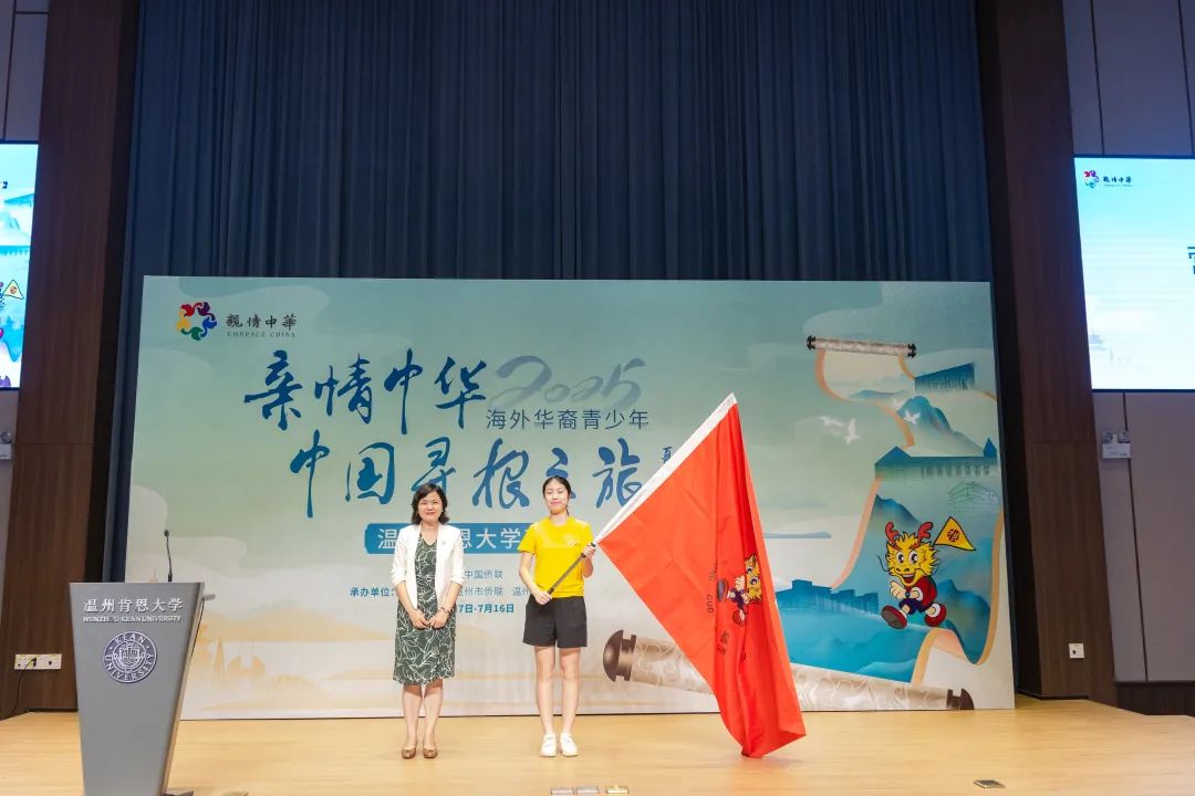 吴娜丽向营员代表授旗,宣布2025年“中国寻根之旅”夏令营温州肯恩大学营正式启程。