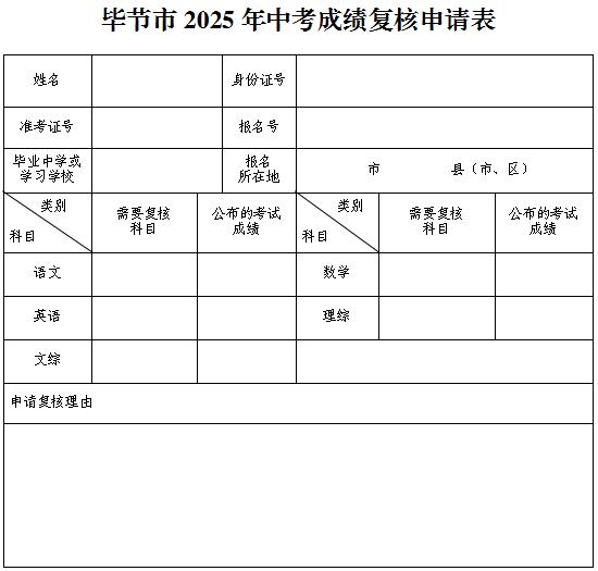 二、成绩复核。成绩发布后,对成绩有疑议的考生于7月9日成绩公布后至7月10日16:00内持考生本人准考证、《毕节市2025年中考成绩复核申请表》至所在县级招生考试机构提出复核申请,逾期不予受理。申请成绩复核的考生于7月11日下午到所在县级招生考试机构领取成绩复核结果。成绩复核不重新评阅试卷,评分标准、评分细则等问题不在复核内容之内。