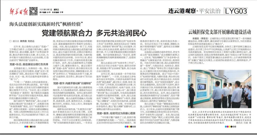原标题:《新华日报:党建领航聚合力 多元共治润民心——海头法庭创新实践新时代“枫桥经验”》