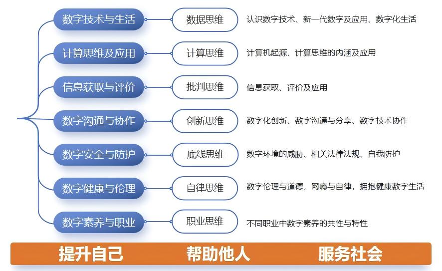 通过联合校内外力量,协调联动教学与教师科研、技术服务、学生活动,开设通识必修课程、通识选修课程、专业选修课、融合网络课堂、实体课堂、实践课堂等,构建起立体化的大学生数字素养教育体系,有效提升大学生的数字素养。具体实施目标如下:
