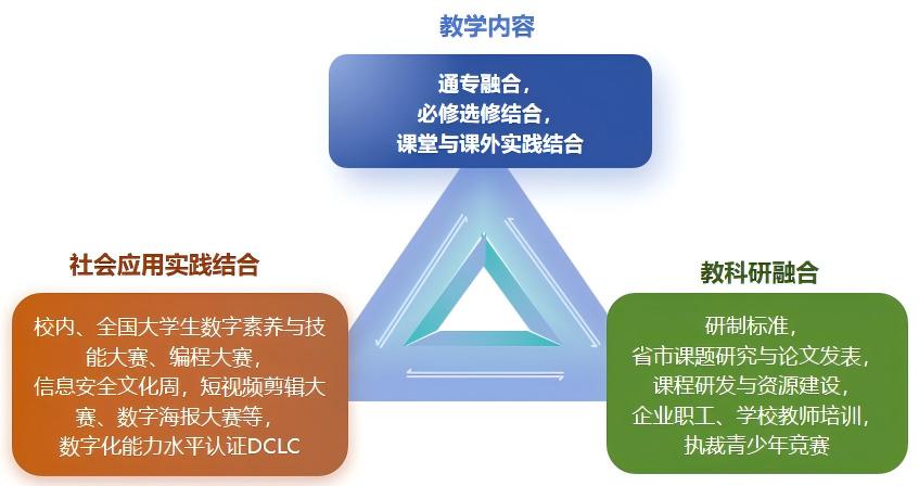 (2)通专融合,三位一体,创新“1+1+X”数字素养教学内容体系。学、研、用相辅相成,构建通识与专业教育融合、必修与选修相结合、课堂与课外实践相结合的“三位一体”教学与训练教学内容体系。