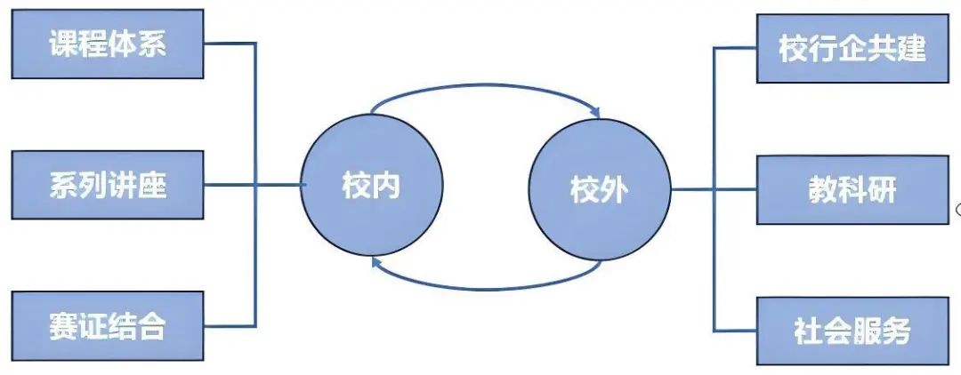 (3)产教融合,多元联动,一体两翼共促数字素养教育出成效。学校与政府、行业、企业等多方合作,挖掘资源、搭建平台,在校内开展校企课程设计与开发、线上线下混合式教学与主动学习、能力竞赛和证书认证的组织与测评等,在校外通过标准研制与能力认证、教科研课题研究、社会服务实践训练、社会培训基地建设、科普推广等举措,多群体、多角度、多渠道融合,共同打造“一体两翼、多元联动”的教育教学方式。
