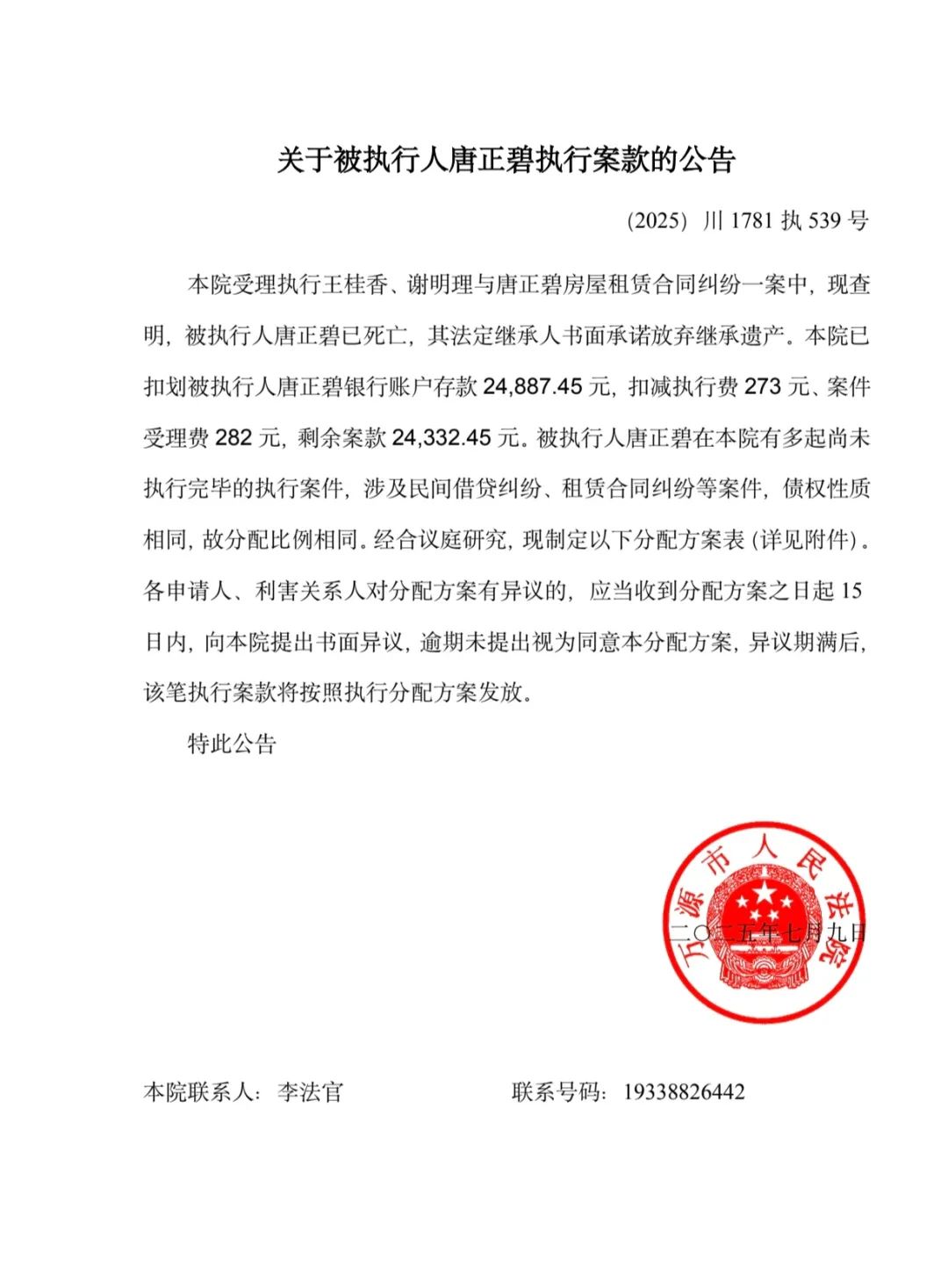 万源市人民法院关于被执行人唐正碧执行案款的公告