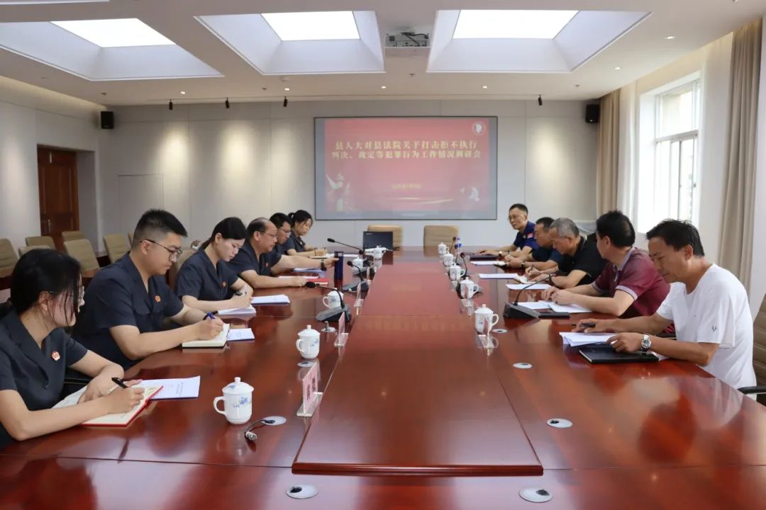 会前,调研组一行参观了县法院的诉讼服务大厅和综合文化展示中心,并对县法院近年来的取得的成绩给予充分肯定。会上,徐维副局长汇报了县法院打击拒不执行判决、裁定罪的工作开展情况,存在的问题以及工作打算。随后,调查组对县法院打击拒执罪工作提出宝贵意见建议: