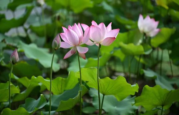 荷叶间,荷花宛如娇羞的少女,红得像霞,粉得似云,白得若雪,或含苞待放,或肆意绽放,在夏风中轻轻摇曳,散发出淡雅清幽的香气。