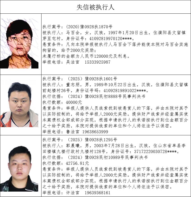 河南省濮阳县人民法院执行悬赏公告(第294期)